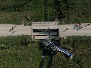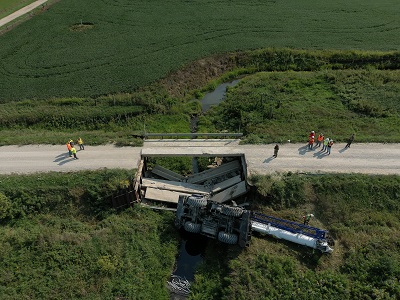 At the scene, a 2020 Tadano GX100 crane being operated by Rod Rogers, of Sergeant Bluff, was traveling West on Pella Road and began crossing County Bridge #123. As the 114,000 pound crane was crossing this bridge without a permit, the bridge suffered a partial structural collapse under the weight. The crane tipped to the North as the bridge collapsed, causing the crane to fall downward and to it’s side. Rogers suffered minor injuries. Cass County Engineer Trent Wolken said the crane is owned by Mammoet Crane Company, which was working with MidAmerican Energy to remove aged-out wind turbine blades. The Iowa DOT and Iowa DNR are both investigating different aspects of this accident. Pella Road remains closed between 765th St. and 780th St. until the bridge can be rebuilt.