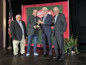 Melvyn Houser was honored as the 2022 ISAC Golden Eagle during a ceremony in Des Moines. (L to R: ISAC President Richard Crouch: Pottawattamie County Auditor Melvyn Houser; Black Hawk County Auditor Grant Veeder; ISAC Executive Director Bill Peterson)