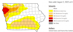 An island of D1 category moderate drought introduced two weeks ago in southeast Iowa is expanding across the southern and central part of the state into southwest Iowa. Plymouth County and the northern portion of Woodbury County in northwest Iowa are dealing with extreme drought conditions.
