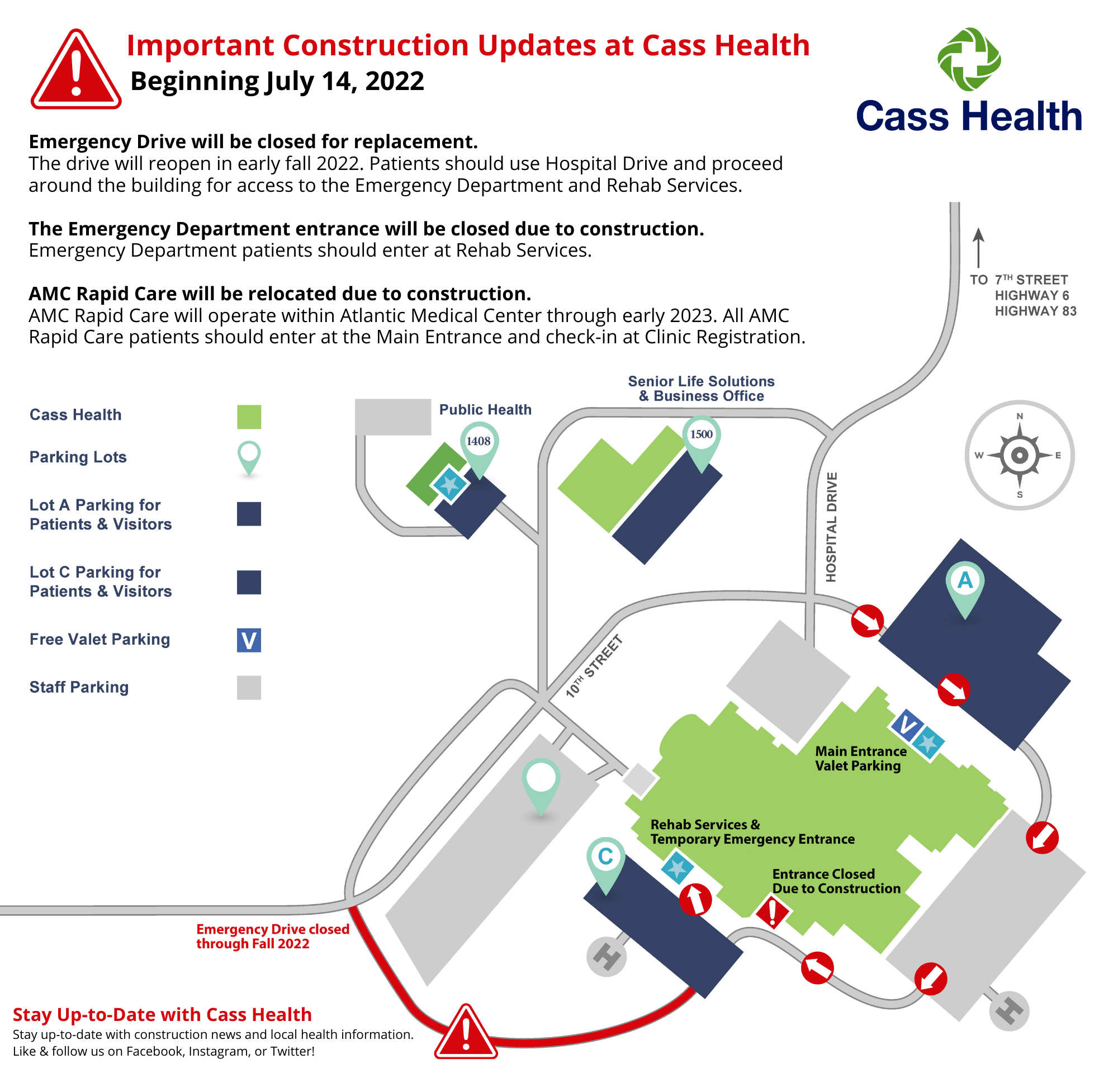 Emergency traffic will be routed around the building instead, and patients will be directed to enter through the Rehab Services entrance due to construction beginning at the Emergency Department entrance. Cass Health Chief Financial Officer Abbey Stangl says “We want to assure everyone that our Emergency Department is open and will remain open throughout this phase of construction. Our team has spent a lot of time ensuring that access to care remains our top priority, and while these changes are inconvenient, we know that they are necessary in the long run.”