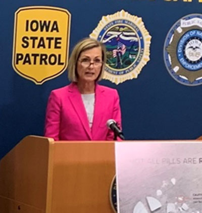 UPDATED – Governor Kim Reynolds held a news conference today to highlight a dramatic increase in fentanyl-laced fake opioid pills that have flooded the state. It comes on the heels of the arrest of five residents of Cass County on federal indictments for conspiracy to distribute fentanyl in a ring discovered after overdose deaths in Cass and Shelby Counties. “Fentanyl is here and the threat is real. In our major metro areas, and in our small towns, no community is immune,” Reynolds says.