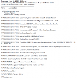 (Atlantic, Iowa) – The Cass County Board of Supervisors will hold their regular weekly meeting Thursday morning (June 30th), in their Board Room inside the Cass County Courthouse, in Atlantic. (ARPA items are with regard to the American Rescue Plan Act for COVID relief) Here’s what’s on their agenda (Click on the image to enlarge):