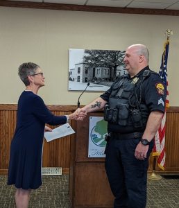 Mayor Grace Garrett congratulates Sgt. Jimmy James