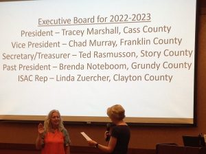 (Moravia, Iowa) – Cass County (IA) Treasurer Tracey J Marshall reports she was last week in Moravia, she was sworn-in as President of the Iowa State County Treasurers Association, an affiliate of (ISAC) Iowa State Association of Counties. During the event, Treasurers from across the State were updated on Iowa legislation with the (DOT) Department of Transportation, (DOR) Department of Revenue, (IADA) Iowa Dealers Association, and the (ISCTA) Iowa State County Treasurers Association. Marshall says “There are many entities who partner with the county treasurer’s office so there is ongoing training needed. At this meeting classes were held on legislation updates to tax sales, cash and investments, and requirements for the Department of Revenue.”