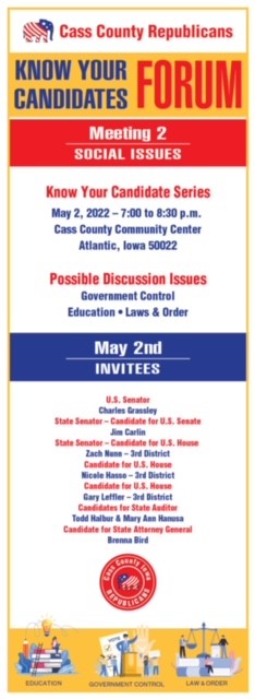 (Atlantic, Iowa) – A REMINDER: The second of two Cass County Republicans “Know your candidates” forums will take place this (Monday) evening, at the Cass County Community Center, in Atlantic. The event will begin at approximately 7-p.m. and conclude at 8:30-p.m. Whereas the last forum covered the candidates’ positions on Laws & Regulations; Energy & Labor, and Exploring Agriculture, this second forum will lean more toward discussion concerning Government Control, Education, and Law and Order.