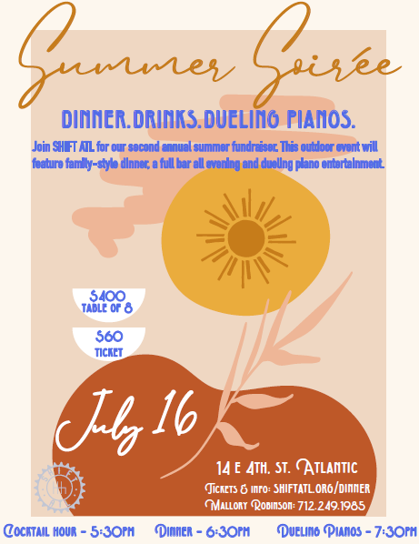 April 25, 2022, Atlantic, IA – Officials with SHIFT ATL in Atlantic say they are excited to invite you to their annual fundraiser for 2022: Summer Soirée. Guests can expect the same great experience as last year including a steak dinner, three hours of dueling piano entertainment by Pianopalooza, full bar and a photobooth! This event will be held on July 16, 2022, on 4th