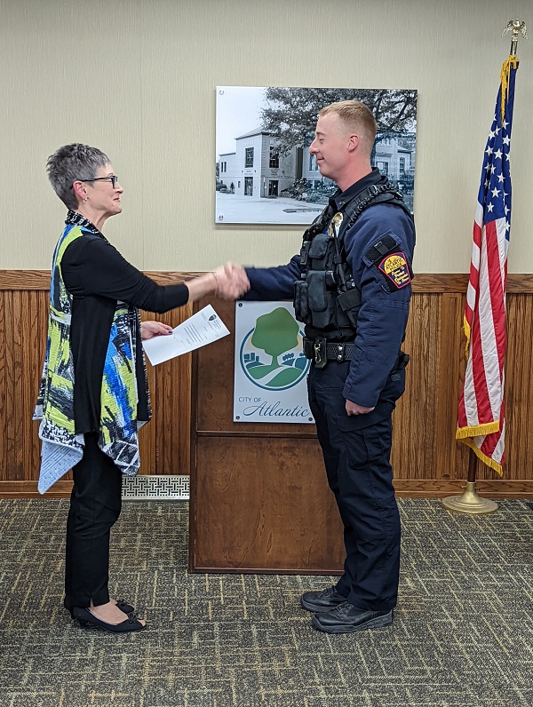 Newly sworn-in Atlantic Police Officer Nicholas Wimmer is congratulated by Mayor Grace Garrett.