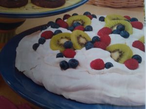 Spread into a 9″ circle on prepared pan, forming a shallow well in the center. Bake at 225 degrees for 1 to 1 1/4 hours or until meringue is dry and firm to the touch and lightly browned. Turn oven off; leave meringue in oven for 1 to 1 1/2 hours.