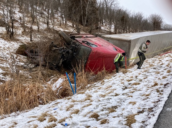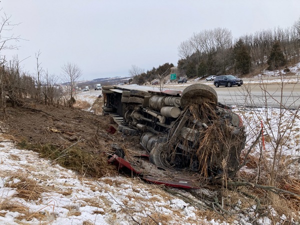 (Anita, Iowa) – The driver of a semi tractor-trailer suffered minor lacerations to his arm this (Friday) afternoon, during a rollover accident on Interstate 80, in Cass County. The accident happened on I-80 westbound at mile marker 64 (near the Anita exit). The semi was pulling trailers registered to UPS. Anita Fire and Rescue arrived on the scene, but the driver refused transport to the hospital.