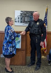 (Atlantic, Iowa) – The Atlantic City Council, Wednesday evening, made an official change of command in the Police Department. The Council paid special recognition to Police Chief Dave Erickson, who is retiring at the end of the month, after more than 25-years of service to the City. Mayor Grace Garrett gave a brief biography of the Chief, and his long career not only with the City, but serving our Country in the U-S Marines.