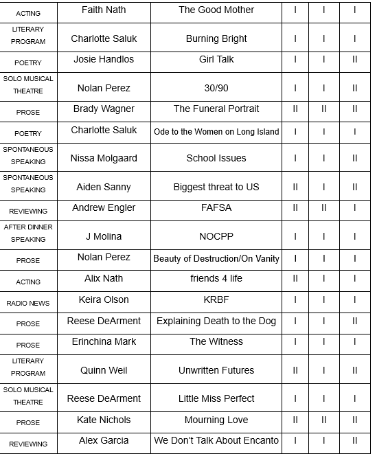 Brandon Baggett, Coach, said “These kids have put in the work and it paid off big time! I cannot say enough about the drive of our young talent and the upperclassmen leading by example. Since we are back to in-person competitions, the events have been so much fun this year and our team is learning so much by watching fellow competitors. As our numbers have grown again this year, the future is very bright for our speech program!”