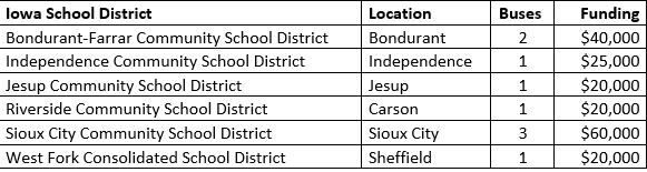 As part of the announcement, six Iowa school districts will be receiving a total of $185,000 in school bus rebate opportunities to replace nine buses through the 2021 DERA School Bus Rebates. In addition to the $17 million announced today, in the coming weeks, EPA plans to announce a new Clean School Bus rebate program under the Bipartisan Infrastructure Law, which provides an unprecedented $5 billion over five years to replace existing school buses with low- or zero-emission school buses.