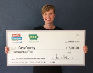 Cass County Wellness Coordinator Brigham Hoegh holds a ceremonial check for the 2021 Healthy Hometown award as part of the Healthiest State awards for that year. (2021 File photo)
