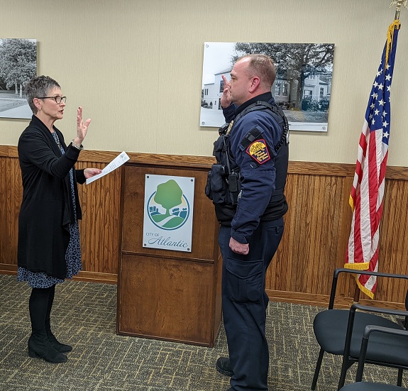 (Atlantic, Iowa) – Atlantic Mayor Grace Garrett, Wednesday evening, administered the Oath of Office to the City’s newest Police Officer. Anthony Snyder comes to the City from Lake City, Iowa (in Calhoun County). He completed the Iowa Law Enforcement Academy last August 28, 2021. He hails from California, where he was a manager for The Walt Disney Company.