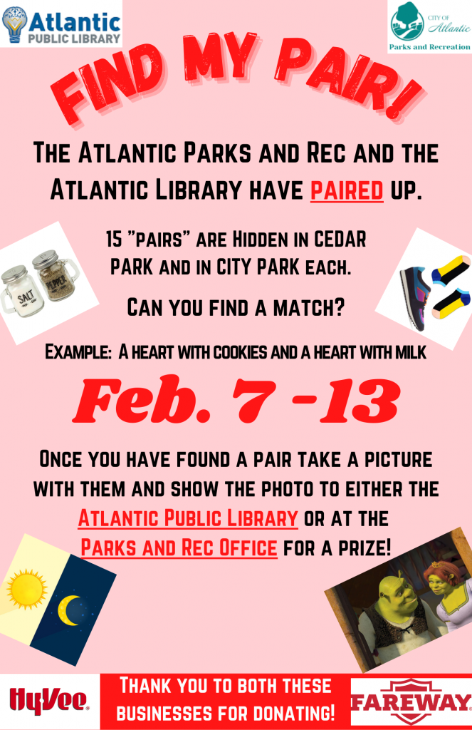 (Atlantic, Iowa) – The Atlantic Parks and Recreation Department is pairing up with the Atlantic Public Library to promote recreation and “I love my library” month. There will be 15 pairs (of things like Salt and pepper shakers, socks and shoes, milk and cookies, etc.) hidden in City Park and 15 pairs hidden in Cedar Park. Find both hearts which pair up, take a picture with both, and show either the pictures to the Atlantic Library Staff OR the Atlantic Parks and Rec Department, to earn a prize. Pairs vary, but there are pairs specific to Cedar Park and pairs specific to City Park.