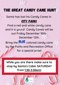 (Atlantic, Iowa) – The City of Atlantic’s Parks and Recreation Department will be hiding Candy Canes in City Park starting Friday December 10th, and continuing through Sunday, December 12th. Parks & Rec Director Bryant Rasmussen said “Blue candy canes, which are hidden, and can be returned to the Parks and Rec Office for a special prize. If people go on Saturday, Santa will be at the (downtown) City Park, from 1:30-to 3:30-pm.