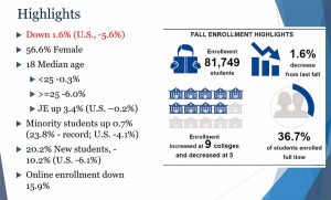 He says a decline in high school graduates deciding to go to college also plays into the enrollment issue. They track that by the number of high school students who sign up for the free college aid availability assessment. “Those trends have been generally downward — which is a bit worrisome. So, we are watching that and generally how students and families think about college,” Varner says. One change saw a drop in female enrollment. “Because the national trend there is actually for the male students to be falling off. Instead, we saw female students slip about three percent,” Varner says. “since about 1980, roughly 40 years, we had this roughly a 60-40 split. We were surprised to see male students increasing this fall.”