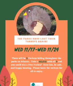 In other news, the Parks and Rec Department is preparing for a “Turkey Hunt,” with wood cut-out turkeys hidden in the City Parks. Visitors can take a selfie with the turkeys and send them in, with the possibility of winning some “grab bag” prizes. Nine turkey’s will be hidden through the City parks, but Bryant won’t give any more clues as to where. And, the Scarecrow Contest in Downtown Atlantic raised about $200 for the Atlantic Food Pantry, he said.