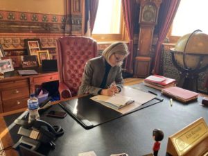 Governor Reynolds signs the redistricting plans into law. (photo from Governor’s Twitter feed.)