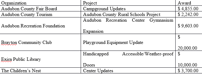 All grantees met the criteria as Audubon County nonprofit agencies or organizations with charitable missions supporting community needs in the areas of civic engagement, culture, health, education, and social services. Only organizations providing services in Audubon County were eligible to apply. These grant funds were made possible by the generosity of donors to the Audubon County Community Foundation and the following charitable funds allocated through the community foundation: Audubon Masonic Association Endowed Fund; Audubon State Bank/Stephen Garst Endowed Fund; Charles T. and Kathleen K. Manatt Endowed Fund; Leon and Iva Milliman Endowed Fund for Audubon County, Iowa; Fred and Evelyn Nissen Endowed Fund for Audubon; and Merle and Norma Petersen Endowed Fund.