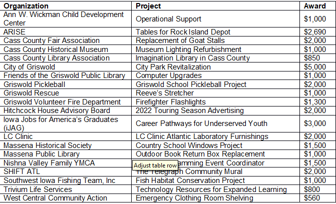(Atlantic, Iowa) – The Cass County Community Foundation has awarded $33,200 to Cass County nonprofit organizations and community projects during its Fall 2021 Grant Cycle. Including these most recent grants, the Cass County Community Foundation has distributed over $2.4 million in grants and scholarships over the last 23 years.