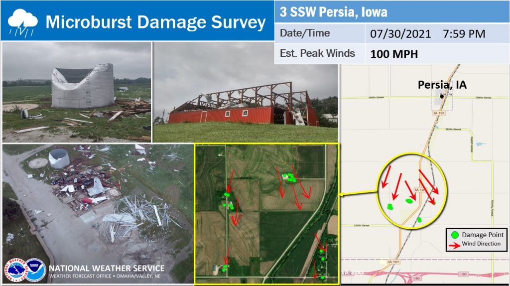 The National Weather Service in Omaha reports a severe thunderstorm caused microburst wind damage south of Persia, in Harrison County (Iowa), last Friday, July 30th. The extent of damage suggested wind speeds around 100 mph. Several grain bins and barns sustained damage from this intense but fairly narrow wind event. Most of the damage was concentrated in a 1.15 square mile area. There were no injuries reported.