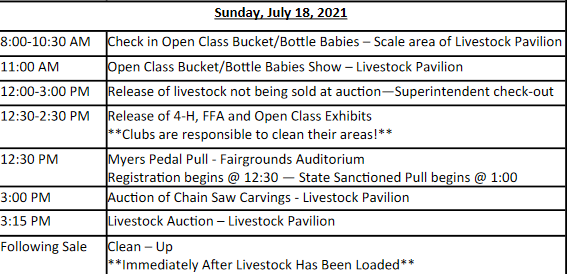 Monday: 5:00 p.m. – 4-H/FFA Livestock Auction; Friday, 7/23: Figure 8 Races at the Grandstand.