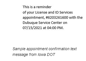 The only time the Iowa DOT will send you a text message related to your driver’s license is to confirm an appointment you have scheduled with them and it will not contains links. Depending on the settings, some mobile devices may generate what looks like a link because it sees the confirmation number as a phone number. Your device may also attempt to add a link to create an appointment on your calendar. The Iowa DOT text message is simply a reminder and does not require you to take any action to confirm your appointment on your mobile device.