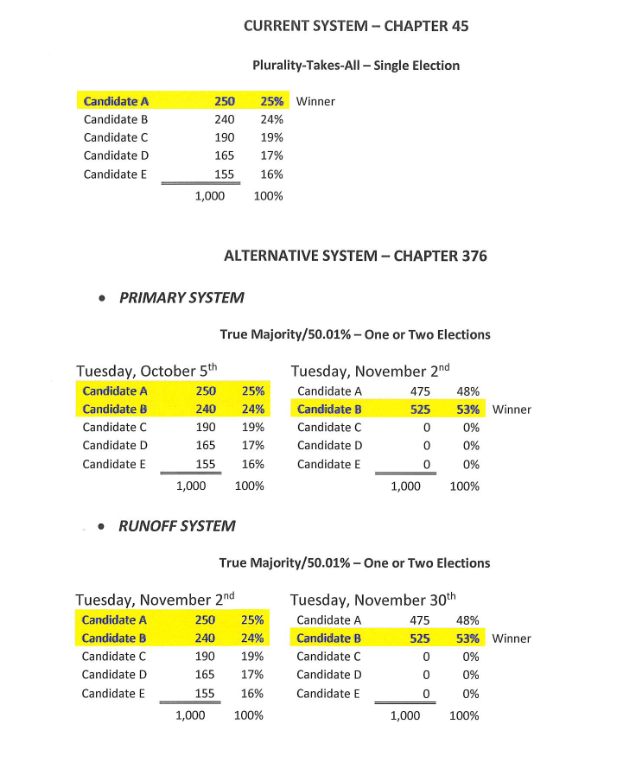 John Lund says Atlantic currently has a “plurality-takes-all” system, where someone only needs to get the most votes on the first and only ballot, to win (see the chart below). Under the alternative, Primary System, a true majority, 50.01 (or, 50+1, if you will) is required to become Mayor, a member of the Council, and Park Board. Iowa allows for both types of elections.