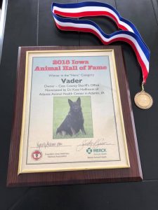 Saturday night, Deputy Quist posted on the I80 K9 Facebook page, “It has been a rough few days here so has taken a bit to post. We said good bye to a warrior, a friend, a family member. Such a great dog from our friends at Canczechdogs. Thank you to Dr. Kate at Atlantic Animal Health Clinic for taking such good care of him. Under the stars and stripes- the country and citizens he worked for and protected. Highly awarded with so many achievements unnoticed. We love you Vader.”