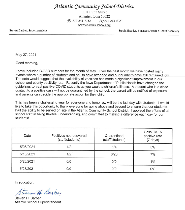 Atlantic School District Superintendent Steve Barber has released a monthly letter to parents, students, staff and patrons of the District, with regard to COVID-19 information. See the letter below
