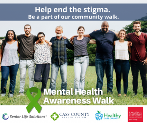 “We welcome participants of all ages to join us to show support for mental health awareness. We all need to help end the stigma around seeking care for mental health, and showing up to community events like this is one small way that each of us can help normalize mental health care and show our neighbors that we’re here for them,” said Karmen Roland, RN, Program Director of Senior Life Solutions. The walk will kick-off at 9 am in City Park at 6th and Chestnut. Participants will walk on the sidewalks to the Rock Island Depot, and then loop back to the park. Information about mental health services as well as light refreshments will be available in City Park. “People across the county identified mental health as the number one health need in the recent Community Health Needs Assessment. It’s so important to have events like this where we can come together and show that mental health matters. It’s OK to not be OK. We want to end the stigma in Cass County,” said Brigham Hoegh, Cass County Wellness Coordinator. “Green is the official color of mental health awareness, and while we encourage folks to wear green – you don’t have to! Just come and join in the fun, show your support, and get in some great exercise, too,” said Roland. |