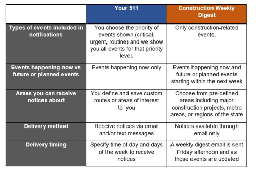 As we move into construction season, one of the most helpful new features is the Weekly Construction Digest. You can choose from pre-defined areas that include major construction projects, metro areas, or regions of the state, and 511 will give you a heads-up regarding construction events starting the next week about active construction events happening in that area. The weekly digest is different from the “Your 511” feature that has been available for some time in that it is only available via email, includes only construction events (Your 511 also includes other traffic incidents), and is for pre-defined areas, not custom routes.