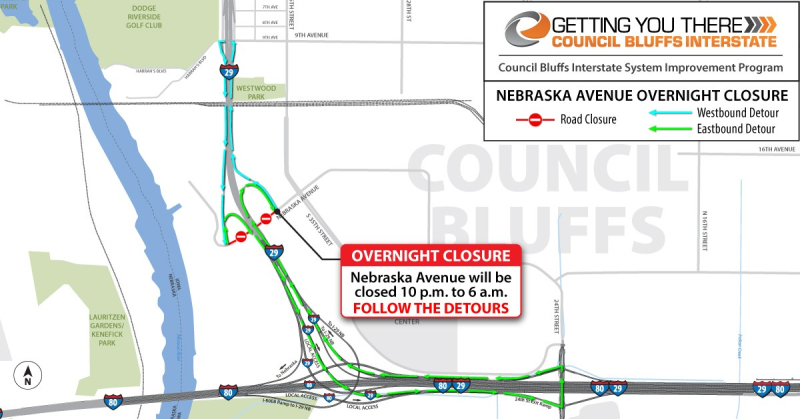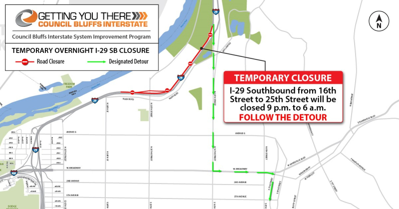 COUNCIL BLUFFS, Iowa — April 2, 2021 – Council Bluffs residents and interstate travelers will soon notice construction activities beginning near the Interstate 29/I-480/West Broadway System Interchange. There will be planned, temporary, overnight and long-term closures occurring throughout next week. Closures will be occurring on the interstate and local roadways. Detours will be provided. All dates and events may change due to weather and field conditions.