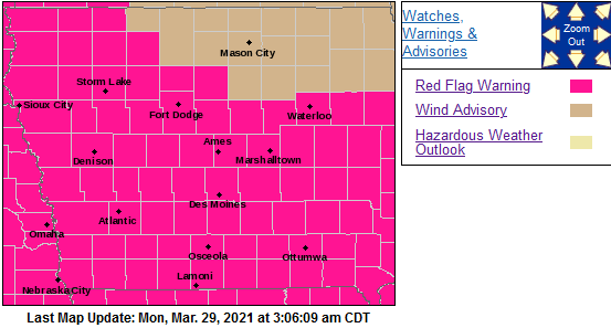 A RED FLAG WARNING is in effect from Noon today (Monday) until late this evening all but extreme northeast Iowa, and far western Nebraska, for Extreme Fire Weather Conditions. In addition, a WIND ADVISORY remains in effect from Noon today until late this evening. A combination of warming temperatures, strong southerly wind, low relative humidity, and relatively dry prairie grasses and other fuels will create extreme fire weather conditions. Any fires that start this afternoon may spread rapidly and become uncontrollable.