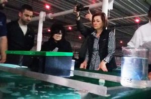 (Radio Iowa) Governor Kim Reynolds visited the NaturalShrimp facilities in Blairsburg and Webster City, Friday. The Dallas, Texas-based company this week began the process of stocking the shrimp at the two Hamilton County locations. “For them to come in bring the technology that really eliminates the wastewater that the previous facility was dealing with, it is exciting,” Reynolds says.