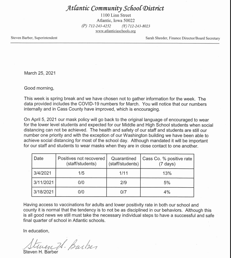 Atlantic School District Superintendent Steve Barber, Thursday released an updated report on plans for COVID-19 safety after Spring Break. The letter to parents, students and district patrons is as follows:
