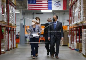 Michelle Book, president and CEO of the Food Bank of Iowa gives Doug Emhoff, the husband of Vice President Kamala Harris, Agriculture Secretary Tom Vilsack, and U.S. Rep. Cindy Axne, D-Iowa, a tour of the Des Moines facility Monday, March 22, 2021. (Zach Boyden-Holmes/The Des Moines Register via AP)
