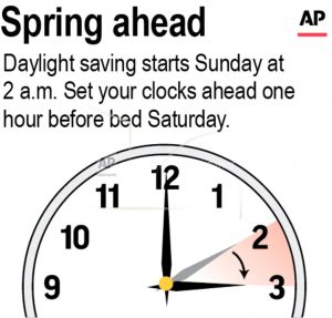 Don’t forget to set your clocks an hour ahead, usually before bed Saturday night, to avoid being late for Sunday morning activities. No time change is observed in Hawaii, most of Arizona, Puerto Rico, the U.S. Virgin Islands, American Samoa, Guam and the Northern Marianas. Standard time returns Nov. 7.