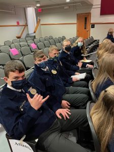 (By Atlantic FFA reporter Aspen Niklasen) – On Saturday, March 6th, 2021, 30 members of the Atlantic FFA chapter competed in the District Career Development Events in Corning. The District FFA CDE is the second round of FFA speaking events with the top 2 individuals and teams advancing to State FFA Convention in April. During the District Business session Sophomore Dylan Comes was elected as the District treasurer for 2021-22. Comes will have several new responsibilities in his office. To earn his newly elected spot he had to give a speech and answered two questions earlier during the business session. Comes said “It was a very challenging and fun experience. I am really looking forward to all the new people I will meet, all the things I will learn, and places I will go for the next year.”