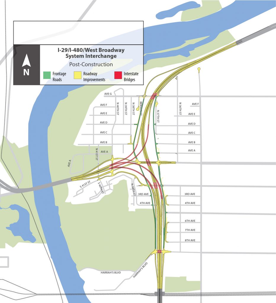COUNCIL BLUFFS, Iowa — Mar. 11, 2021 – Council Bluffs residents and interstate travelers will soon notice construction activities beginning near the Interstate 29/I-480/West Broadway System Interchange. According to the Iowa DOT, the I-29/I-480/West Broadway System Interchange project includes the area of I-29 north of the Union Pacific Railroad bridge to a point just west of North 25th Street, along with the I-480 corridor to the Iowa side of the Missouri River crossing.