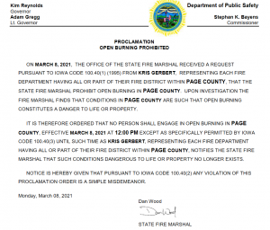 State fire officials have declared an open burn ban in Page County due to dangerous fire conditions. (See the proclamation below) The ban is in effect from Noon today (March 8), until further notice, and will only be lifted once conditions allow. The State Fire Marshal’s Office says it received a request from Page County Emergency Management Coordinator Kris Grebert on behalf of the county’s fire chiefs for the burn ban. Grebert says high winds and low relative humidity in the forecast make for dangerous fire conditions in the days ahead. Those violating the burn ban will be subject to a simple misdemeanor charge.