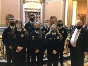 DES MOINES, IOWA— FFA members from Atlantic FFA and other FFA members from across Iowa converged on the FFA Enrichment Center at DMACC and the Iowa State Capitol in Des Moines, recently, to build character and promote citizenship, volunteerism, and patriotism. Atlantic FFA Reporter Aspen Niklasen says Atlantic FFA members, Taylor McCreedy, Alyssa Derby, Craig Alan Becker, Gunner Kirchoff, Aspen Niklase, Wyatt Redinbaugh, Garrett Reynolds and more than 100 high school students wearing blue corduroy from 20 schools flooded the Iowa State Capitol Building in Des Moines on February 16th. The students visited with legislators, exhibited skills learned in the agriculture classroom and learned the importance of citizenship. This was all part of the 36th Annual Iowa FFA Legislative Symposium and FFA Day at the Capitol.