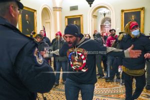 FILE – In this Jan. 6, 2021, file photo, Trump supporters gesture to U.S. Capitol Police in the hallway outside of the Senate chamber at the Capitol in Washington. Doug Jensen, an Iowa man at center, was jailed early Saturday, Jan. 9, 2021 on federal charges, including trespassing and disorderly conduct counts, for his alleged role in the Capitol riot. Jensen, 41, of Des Moines, was being held without bond at the Polk County Jail and county sheriff’s Sgt. Ryan Evans said he didn’t know if Jensen had an attorney. (AP Photo/Manuel Balce Ceneta, File)