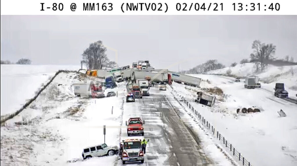 This image provided by the Iowa Transportation Department from a traffic camera shows a massive pileup on Interstate 80, Thursday, Feb. 4, 2021, west of Newton, Iowa. A snowy section of Interstate 80 was closed Thursday afternoon in central Iowa, after the massive crash involving roughly 40 vehicles. Iowa authorities closed the eastbound lanes of the interstate west of Newton after the chain-reaction crash. (Iowa Transportation Department via AP)