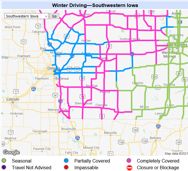 In some cases, both lanes or a single lane was blocked or partially blocked in several locations. Highway 92 eastbound near Treynor was blocked on the right should, due to an accident. Tow bans are being implemented for Pottawattamie, Cass and Mills Counties. If your vehicle enters the ditch or median, it will not be towed until weather conditions improve.