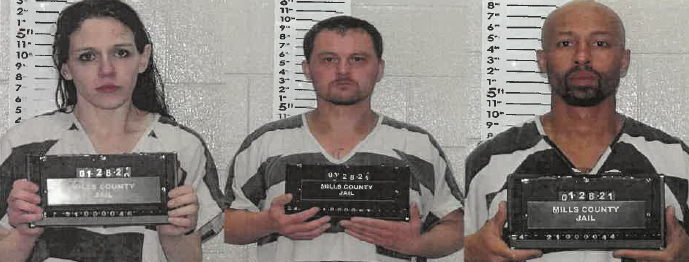 The Mills County Sheriff’s Office reports two men and a woman were arrested on numerous charges Thursday evening, following the pursuit of a Nebraska plated vehicle during a traffic stop in the 29,000 block of Highway 34. The incident began at around 6:30-p.m. When a Mills County Deputy attempted the traffic stop, the vehicle failed to stop and attempted to flee at speeds in excess of 100 mph. In the attempt to flee, the vehicle became stuck on a minimum maintenance road. Two of the three suspects inside the vehicle took off on foot, while the third was arrested at the vehicle.