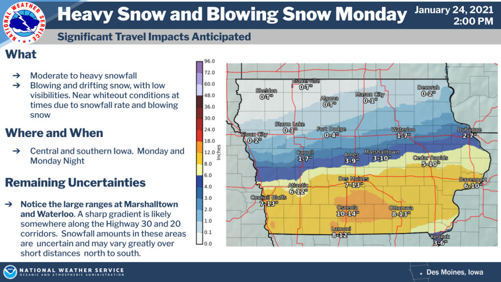 Moderate to heavy snows are expected to spread north to south into Iowa Monday morning and continue well through the evening hours. The National Weather Service says this will result in widespread moderate to heavy snow accumulations across central and southern Iowa. Accumulations of a foot or more are possible south. There will also be a sharp gradient in snowfall accumulations somewhere near the Highway 30 corridor.