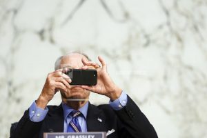 FILE – In this Monday, Oct. 12, 2020 file photo, Sen. Chuck Grassley, R-Iowa, uses his smartphone during a hearing on Capitol Hill in Washington. Researchers from NATO StratCom, a NATO-accredited research group based in Riga, Latvia, paid three Russian companies 300 euros ($368) to buy 337,768 fake likes, views and shares of posts on Facebook, Instagram, Twitter, YouTube and TikTok, including content from verified accounts of Senators Grassley and Chris Murphy. Both senators consented to participate. (Erin Schaff/The New York Times via AP, Pool)