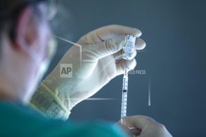A vial of the Pfizer-BioNTech COVID-19 vaccine is drawn into a syringe, Monday, Dec. 14, 2020, on the 12th floor of the University of Iowa Stead Family Children’s Hospital in Iowa City, Iowa. (Joseph Cress/Iowa City Press-Citizen via AP)